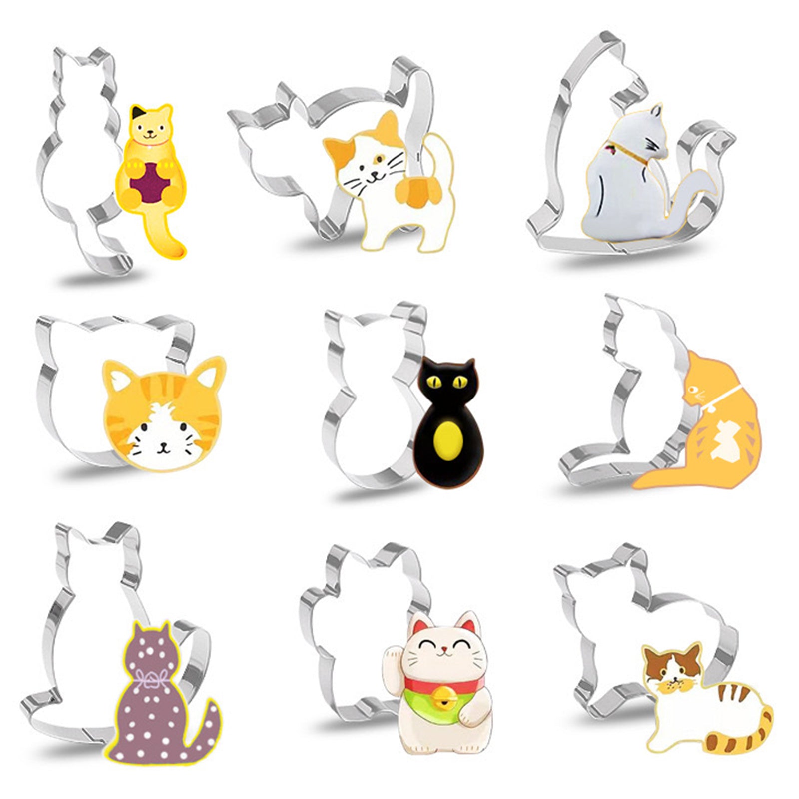 【Cat Cookie Cutters Set】9 PCS Different shapes cat mold. Cookie cutter shapes as cozy cat, sitting cat, running cat, playful cat, kitten and curled cat.