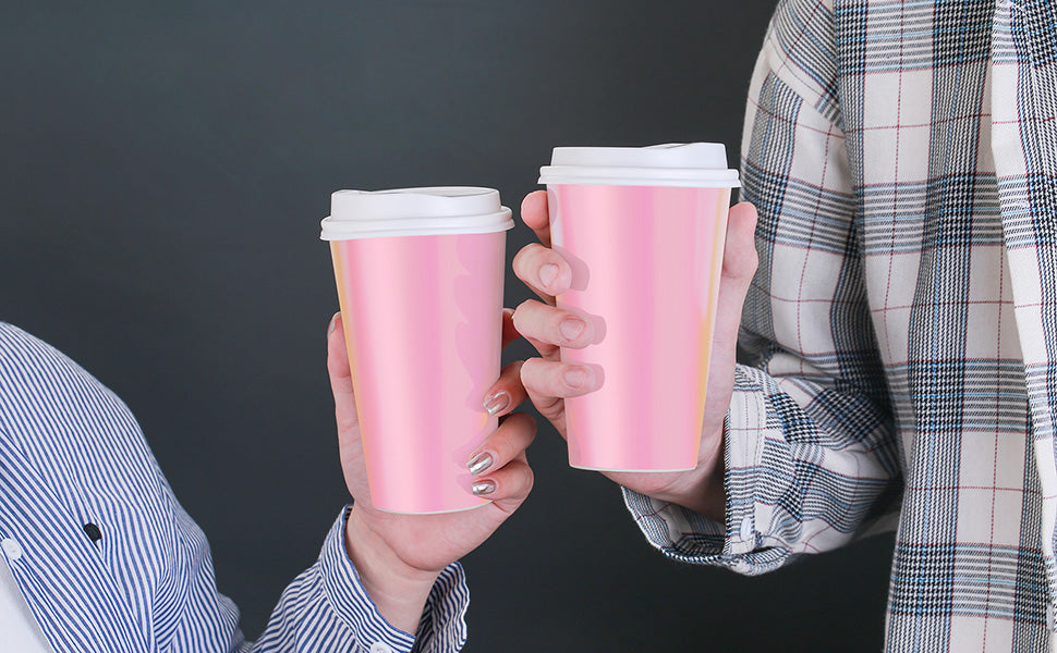 Pink Paper Cups 16oz [20 pack] Disposable Iridescent Party Cups with Lids
